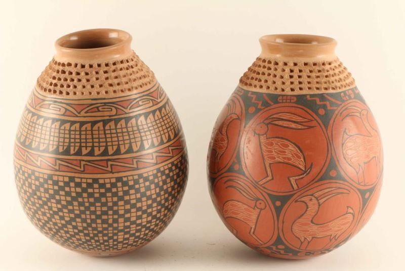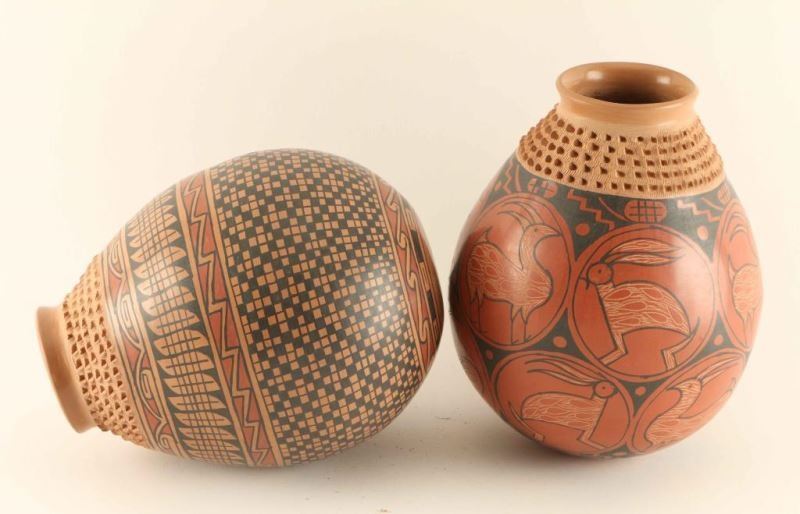 One hand painted eye dazzler etched design on polychrome Casa Grande pottery measures 9"x7" and one hand coiled animal design polychrome mata ortiz pot measures 9"x7".