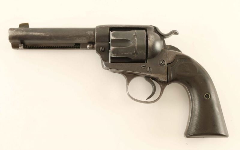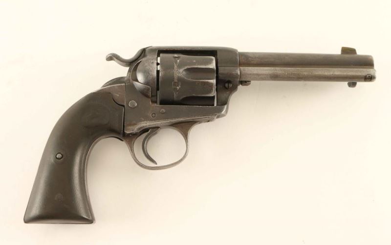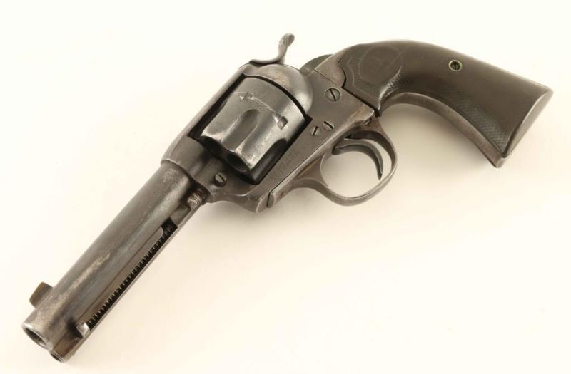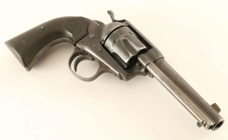 'First Generation' Vintage single action six-shot revolver chambered in .45 Colt, circa 1902. Introduced in 1894, the Colt Bisley was marketed as a target revolver and got it's name from the Bisley shooting range in England. Features a blued finish, 4 3/4" barrel with two line address, brass blade front sight, 'v' notched rear sight, ejector rod, smooth trigger, knurled wide low profile hammer spur, fluted cylinder, and two-piece checkered hard rubber grips with Rampant Colt decor. Serial numbers match on the frame, triggerguard and backstrap. Revolver exhibits approximately 20% of it's old blued refinish with the balance of the metal surfaces turned to patina showing some scattered pin prick pitting. The cylinder stops have been lightly punched with a tool and minor protrusions can be seen inside the chambers but this does not appear to interfere with loading the cylinder. Action is crisp with four clicks & very good lock-up, bore is good with some minor pitting, markings are fair and the hard rubber grips are fair as they are worn smooth & fit improperly. Condition is NRA Fair. ***C&R Firearm***