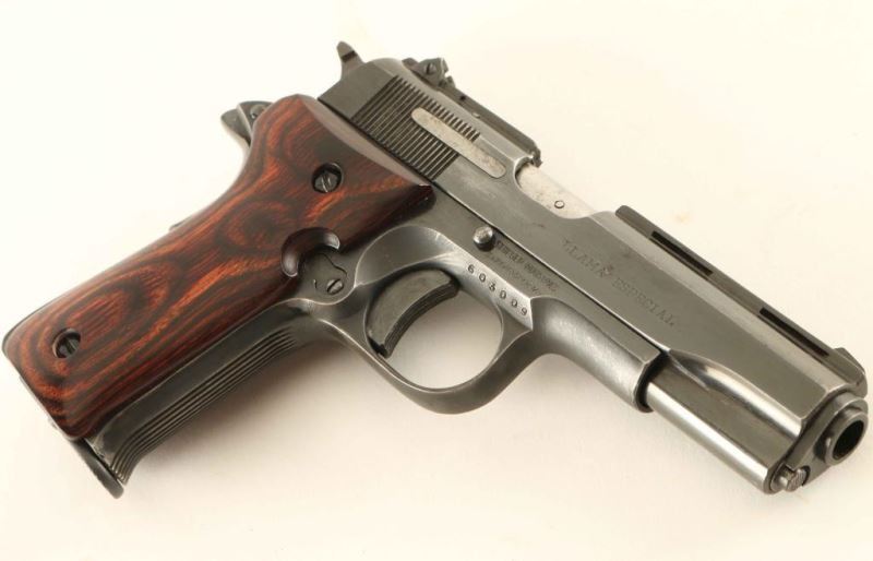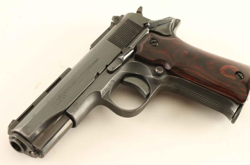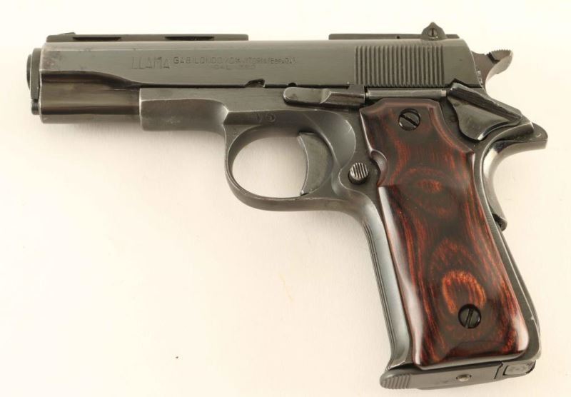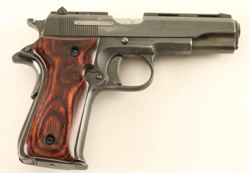 Spanish made single action semi-automatic pistol designed along the lines of a scaled down Colt 1911A1, manufactured circa 1955-1997. Imported by Stoeger Industries of S. Hackensack, N.J. with import marks on the right side of the frame. Features a blued finish, 3" barrel, ventilated sighting rib on the slide, fixed front sight, drift adjustable rear sight, serrated trigger, serrated wide hammer spur, thumb safety, grip safety, push button magazine release, factory 7 round magazine, serrated arched mainspring housing and two-piece smooth laminated rosewood grips. Pistol exhibits approximately 85% of it's original finish showing scattered wear with light oxidation on the right side of the slide. Action is strong, the bore is excellent and the wood grips are fine. Condition is NRA Good to Very Good. ***Modern Firearm***