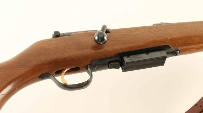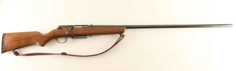 'Model 55' American made magazine fed bolt action shotgun chambered for 3" or shorter 12 gauge shells, manufactured circa 1962-1988. Features a blued finish, 36" full choke barrel, brass bead front sight, flat-top rear sight, smooth gold trigger, polished bolt with turned down bolt handle, cocked indicator, manual safety to the right of the receiver, 2 round detachable box magazine, smooth leather sling and smooth wood pistol grip shoulder stock with recoil pad. Shotgun exhibits approximately 97% of it's original finish showing light wear and couple small spots of light surface rust. Action performs well, the bore is very good and the wood stock is good to very good. Condition is NRA Very Good. ***Modern Firearm***