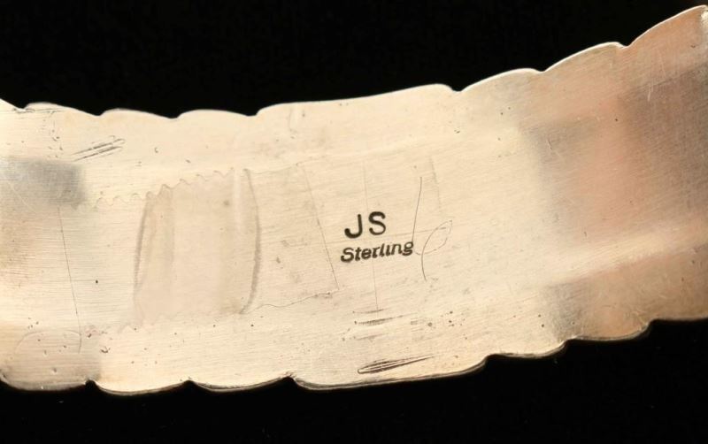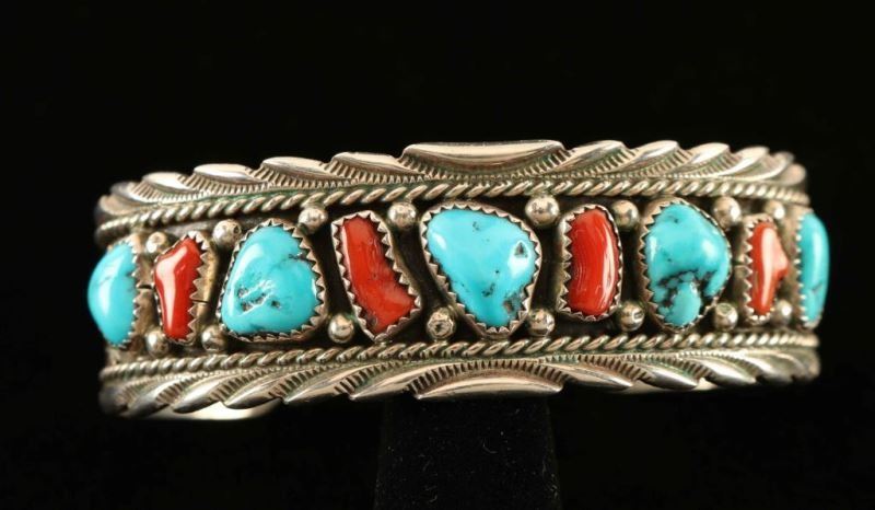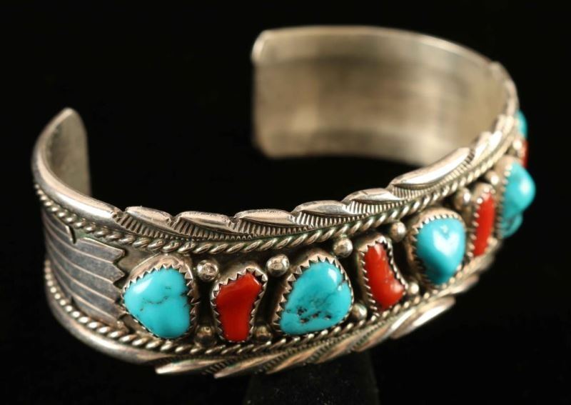 Navajo made sterling silver cuff is set with alternating pieces of coral and turquoise in a rope and scallop motif. Signed 'JS' and 'Sterling'. Inside measures 2 1/2".