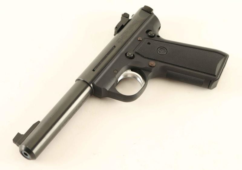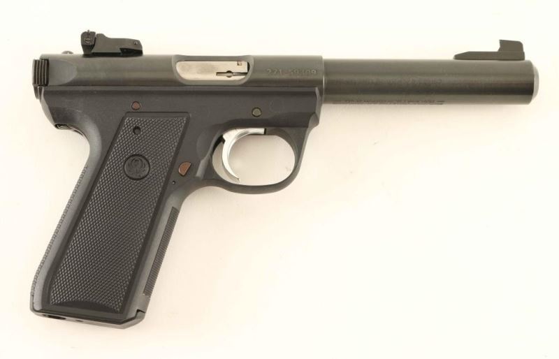 Blowback operated semi-automatic target pistol chambered in .22 Long Rifle, circa 2011. Features a blued finish, 5.5" bull barrel, patridge front sight, adjustable rear sight, drilled & tapped receiver, wide serrated trigger, loaded chamber indicator, bolt hold-open lever, thumb safety, magazine disconnect safety, push button magazine release, factory 10 round magazine, and black polymer grip frame with checkered grip panels. Pistol exhibits approximately 93% of it's original finish showing scattered handling marks/scratches which are predominantly on the barrel. Action is smooth, bore is pristine, and polymer is fine. Condition is NRA Very Good+. ***Modern Firearm***