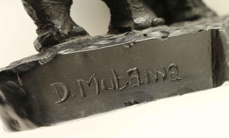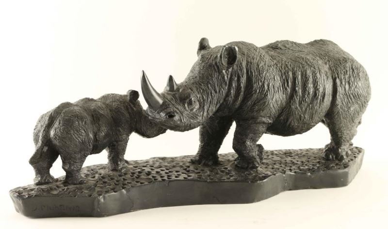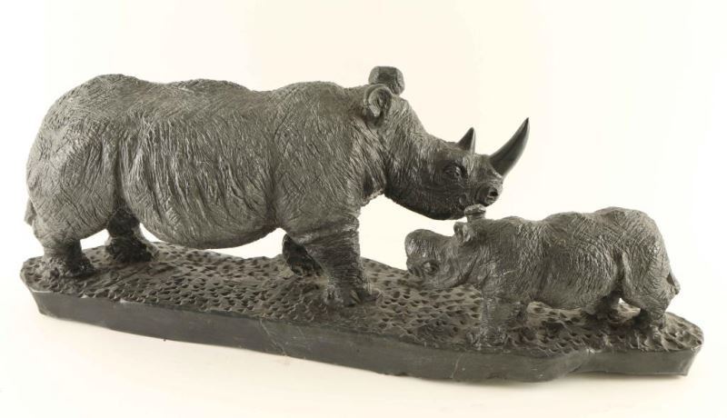 By D. Mubaiwa depicting 2 Rhinos, signed on base, from the Tony Da Costa collection, measures 23"X6", shows old repair.