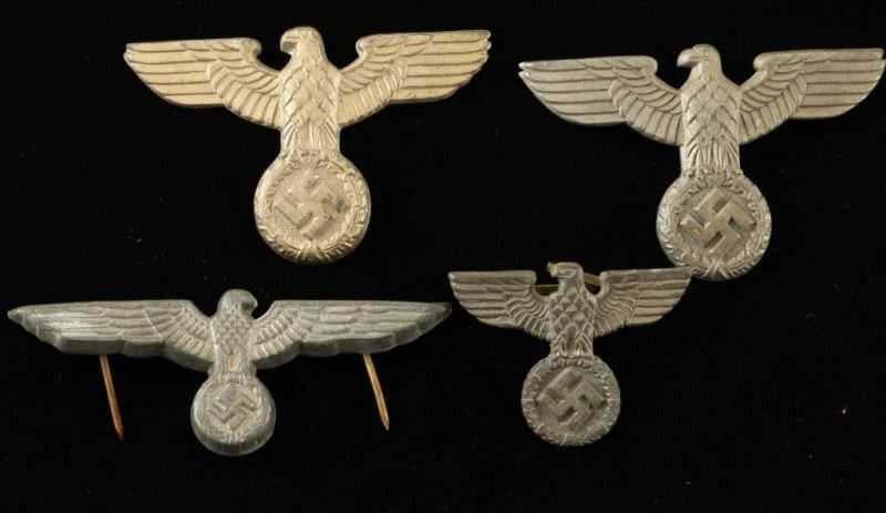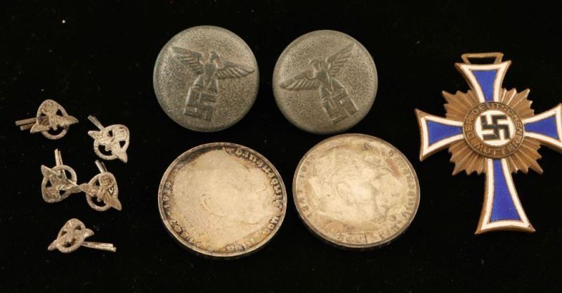 4 original armbands-DAF and German armed forces, 5 German police long service metal devices, 2 political cap eagles-one is missing prongs, 2 NSDAP buttons, an Army qualification badge for radio operator with moth holes, and 1 German Army cap eagle, In display case. Also includes one mother's cross in bronze missing ribbon, small short wing political cap eagle and two Deutsche mark coins.