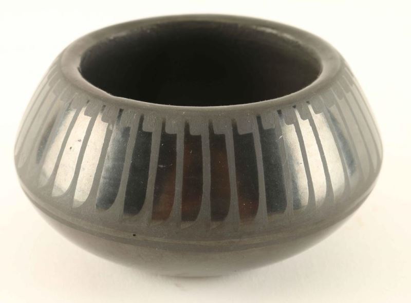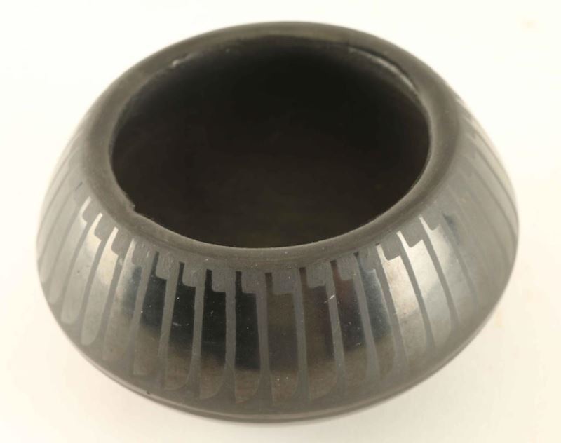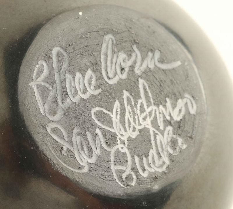 Black feather design signed 'Blue Corn', measures 4 1/4"x2 1/4". A few tiny surface chips otherwise good.