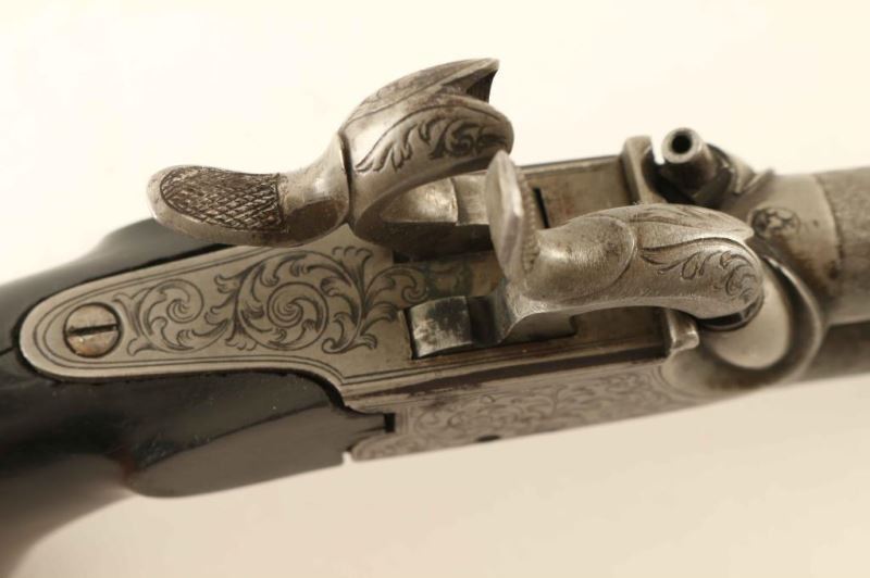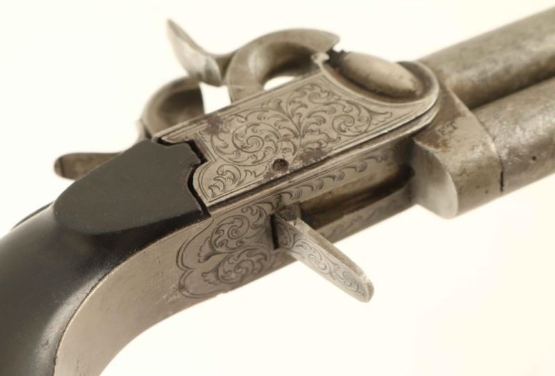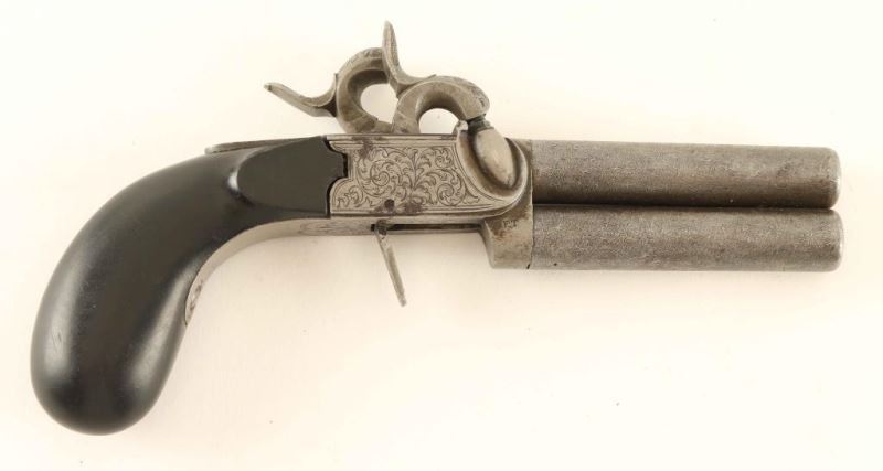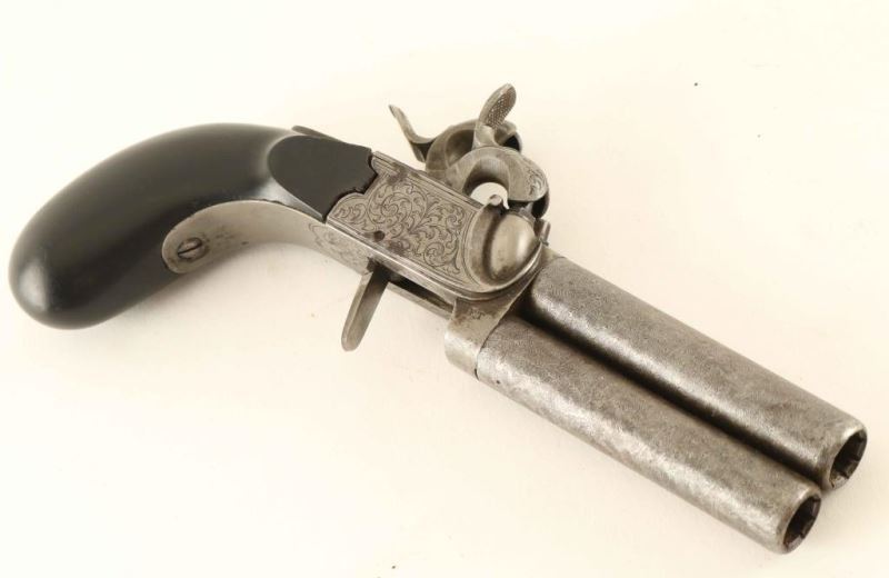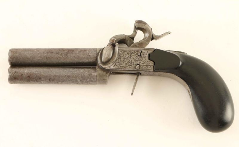 Engraved antique over/under double barrel percussion pistol with an approximate .40 caliber bore. Features 3" damascus barrels, floral scroll engraved frame with French Grey finish, flat flip-down trigger, knurled hammer spur, and smooth ebony bag handle. The frame retains most of it's original finish, and the barrels show strong damascus patters and both the barrels & frame display some scattered rust. The trigger engaged the right hammer but not not the left and causes the trigger to stay down as the left hammer remains cocked, smooth bores are very good and the wood grip is good showing some hairline cracks. Condition is NRA Very Good. ***Antique Firearm***