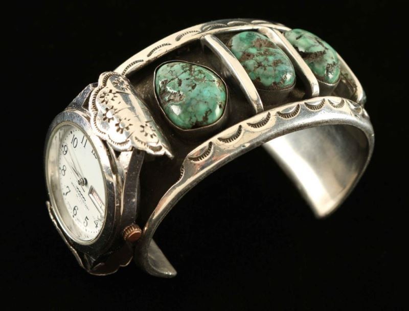 Sterling cuff with etched sun design inset with five cabs of natural turquoise with a silver divider between each piece. Watch face is at the very end of the cuff. Inside measures 2 1/4" signed 'JFR Navajo'.