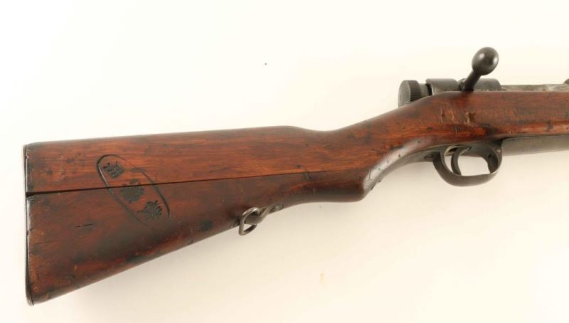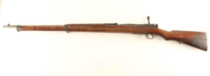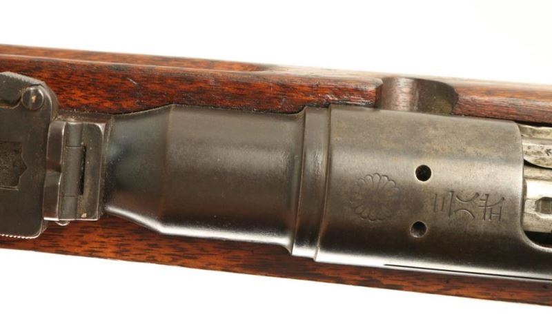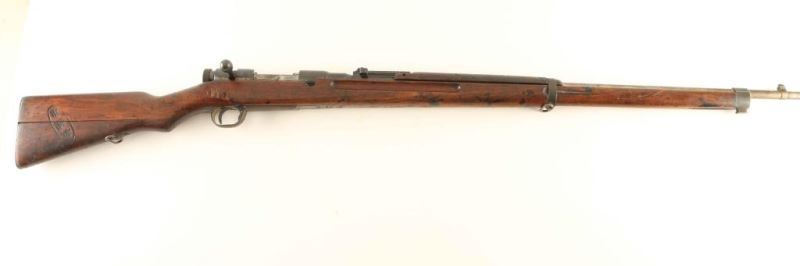 'M1905' Japanese military bolt action service rifle chambered in 6.5mm Arisaka, manufactured circa 1905-1945. Features a blued finish, 31.5" barrel, dovetailed inverted 'v' front sight, adjustable elevation rear sight, bayonet lug, two barrel bands, smooth trigger, straight bolt handle, 5 round internal box magazine with removable floorplate, sling swivels, smooth wood handguard and full-length semi-pistol grip shoulder stock with metal buttplate. The mum is intact and the arsenal marking is believed to be that of the Koishikawa Arsenal or Kokura Arsenal. Serial number are non-matching with the exception of the front barrel band and rear sight leaf. Rifle exhibits approximately 15% if it's original finish showing some bright bluing on the rear of the receiver with the balance of the metal surfaces varying tone of light and dark grey patina. Action is sound, bore is dark with what appear to be good rifling and the wood stocks are good fair to good with several blemishes. Condition is near NRA Good. ***C&R Firearm***