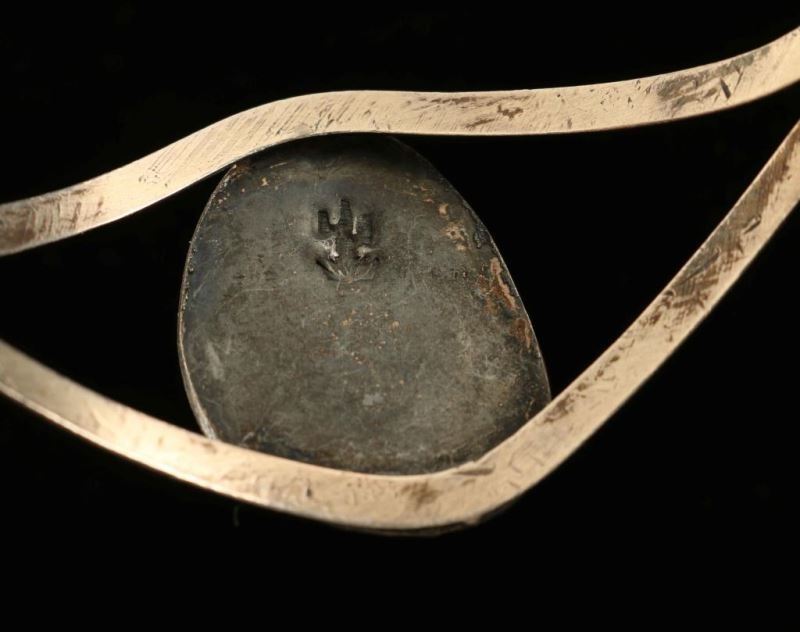 Center triangle cab of turquoise with a lovely brown matrix is surrounded by a silver rope motif. Two open strands of silver join at each end of bracelet. Hallmarked by artist, inside measures 2 3/8".