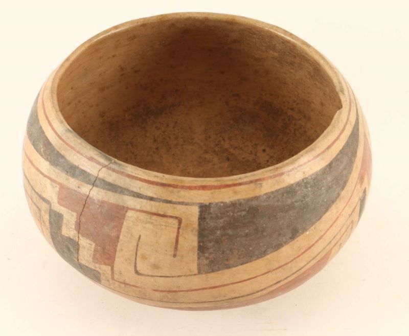 Black and red geometric designs, some chips and one crack on rim. Unknown age or origin. Measures 3 7/8"h x 8"dia.