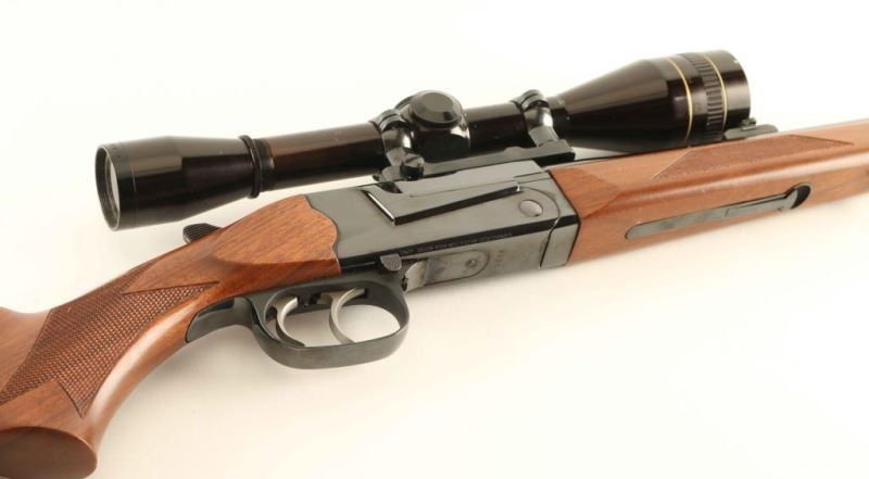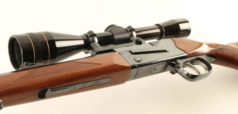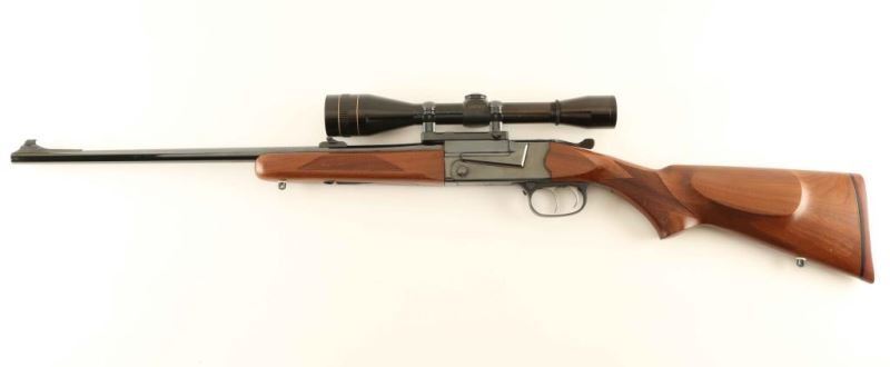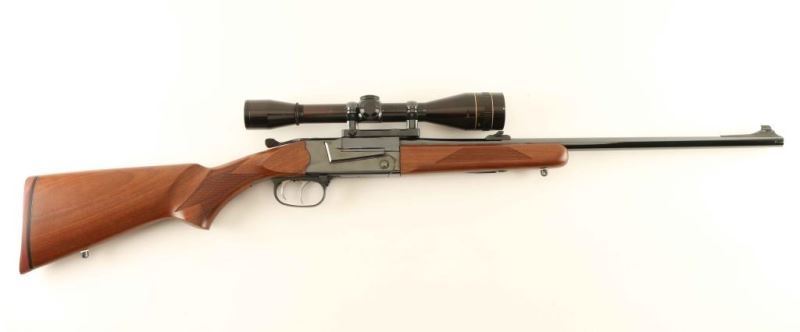 'Aristocrat' Finely crafted modular break-open-action single shot rifle chambered in .30-06 Springfield, manufactured circa 1986-1987. Features a high polish blued finish, 23" tapered barrel, ramped blade front sight with brass bead, flip-up adjustable rear sight, Leupold 8x scope with one-piece base, double set triggers, push button safety, serrated top lever, sling swivels, checkered select walnut forend and pistol grip shoulder stock with right-handed cheek rest & red factory recoil pad. Rifle exhibits approximately 99% of it's original finish showing little to no visible wear. Action is smooth, bore is excellent, optics are sharp and the wood stocks are fine. Condition is NRA Perfect. ***Modern Firearm***