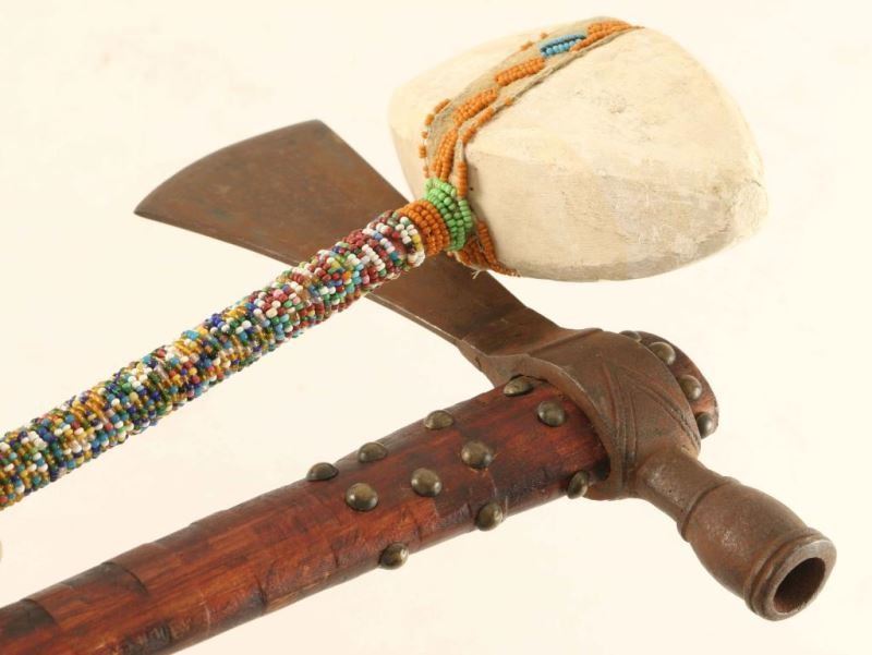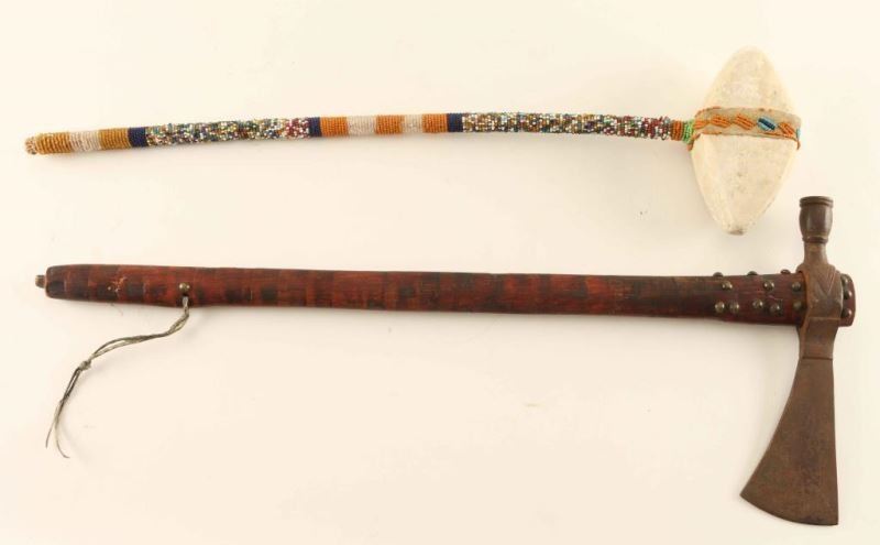 (1) Tomahawk pipe with wooden shaft, metal axe and bowl with brass tack accents on stem. Measures 20 1/2"x5"x8". (1) Sioux 20th Century ceremonial war club with white stone head and beaded handle. Measures 201/2"x5 1/4"