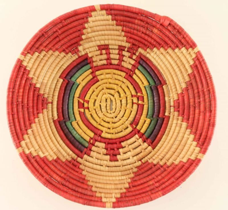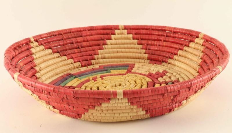 Shallow basket with butterfly and flower motif in center in red, yellow, green and purple. Measures 13"x2 1/2".