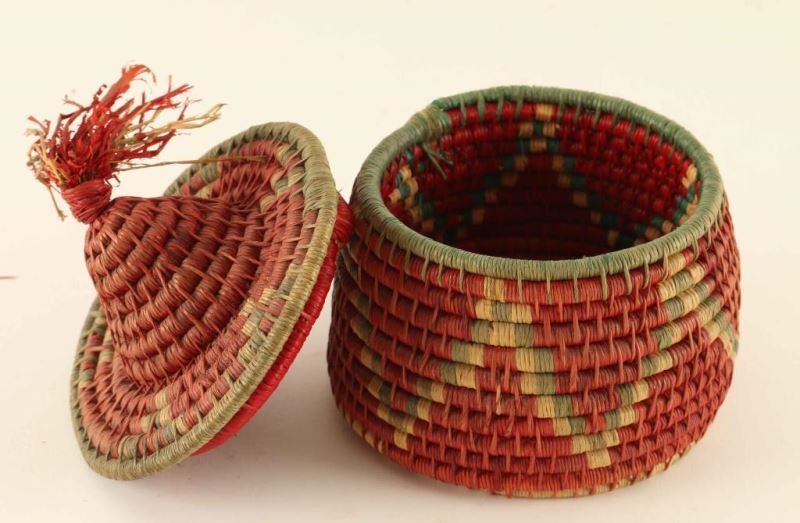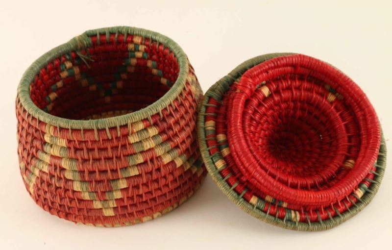 Red and green basket with zig-zag design and conical hat shaped lid with tassel. Measures 4 1/2"x4". Losses to tassel otherwise good.