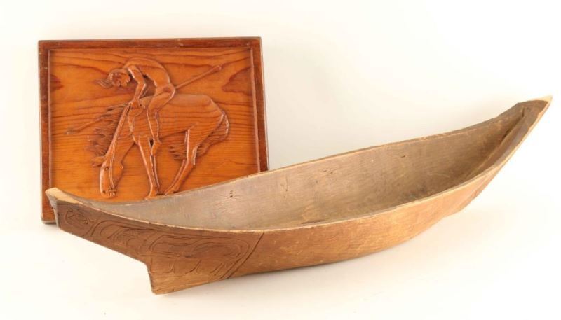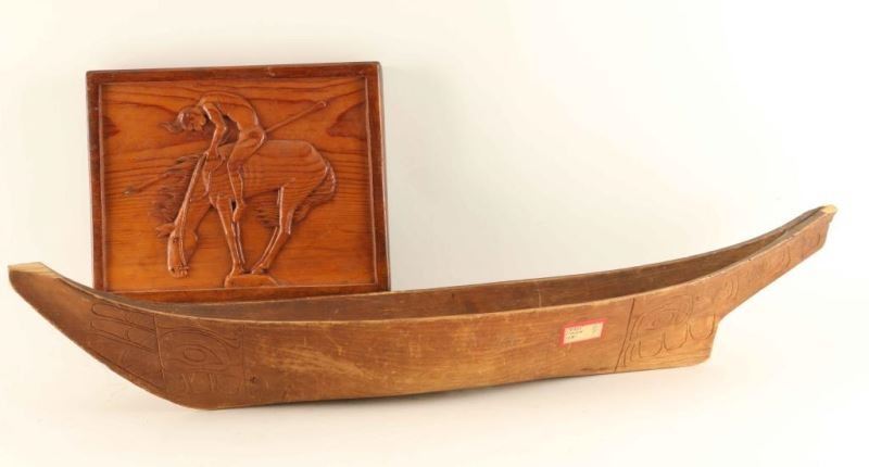(1) Haida design carved wooden canoe with animal motif. Measures 28"x6"x4", circa 1941. (1) Carved "End of the Trail" measures 5"x10".