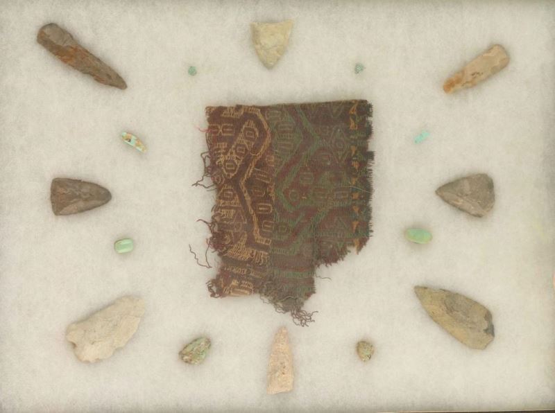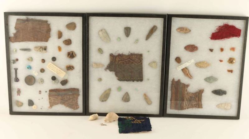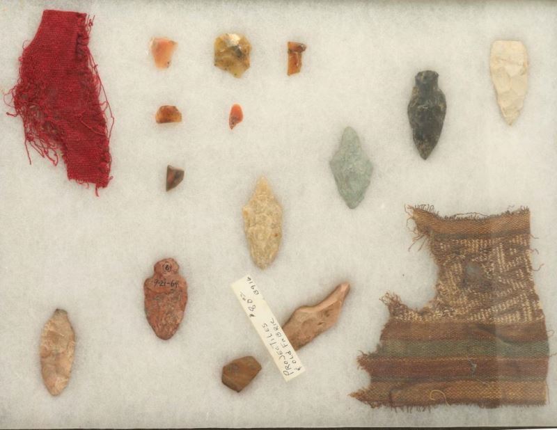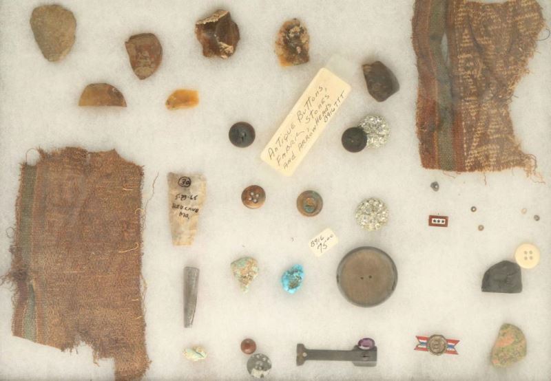 Including; 20th Century carved bone owl fetish, stone hump back animal fetish, tiny key, quilted piece of fabric, (3) 12"x16" Riker mounts with arrowheads, stone projectiles, turquoise, antique buttons, and cloth swatches.