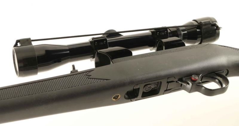American made magazine fed semi-automatic sporting rifle chambered in .22 Long Rifle, circa 1989. Features a tapered 18.5" stainless steel barrel, dovetailed blade front sight with brass bead, adjustable flip-up rear sight, Kmart All-Pro 3x 32mm scope with see through rings, smooth trigger, push button safety, factory 10 round rotary magazine, bolt hold open lever, black finished alloy receiver and a checkered black synthetic pistol grip shoulder stock. Includes the original factory cardboard box with manual and filler screws. Rifle exhibits approximately 98% of it's original finish showing minor edge wear on the receiver with no other wear observed. Action is smooth, bore is excellent, optics are sharp and the synthetic stock is fine. Condition is NRA Excellent in box. ***Modern Firearm***
