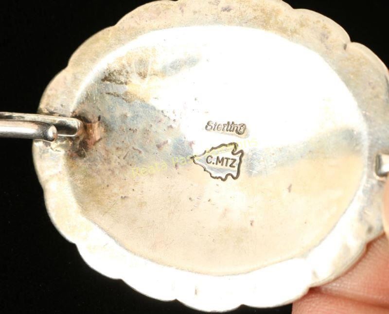13 sterling silver conchos, each with an oval center turquoise cab surrounded by 10 smaller ovals. Marked 'C. MTZ' in an arrowhead and 'Sterling' Measures 37 1/2" long overall.