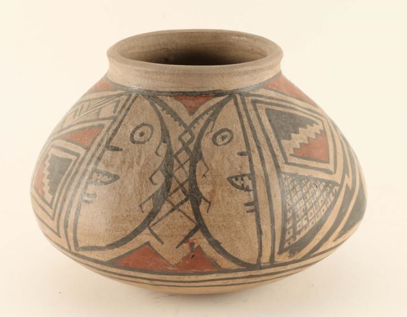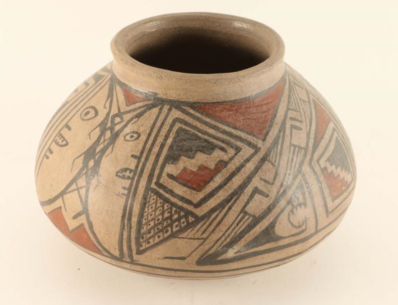 Painted with faces and serpents with terra cotta and black geometric designs. Some small surface chips otherwise good. Measures 6"h x 10"dia.