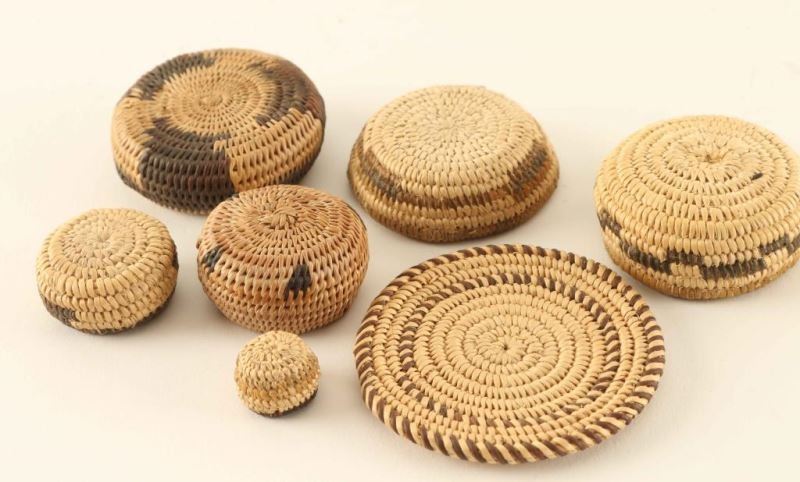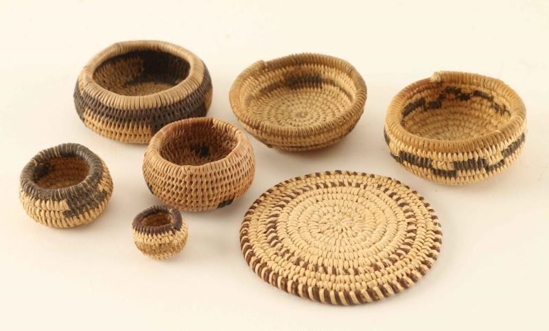 1940s group of 7 miniature baskets including a 2 1/2" plaque and 1/2" to 3/4" bowls. Very nice.