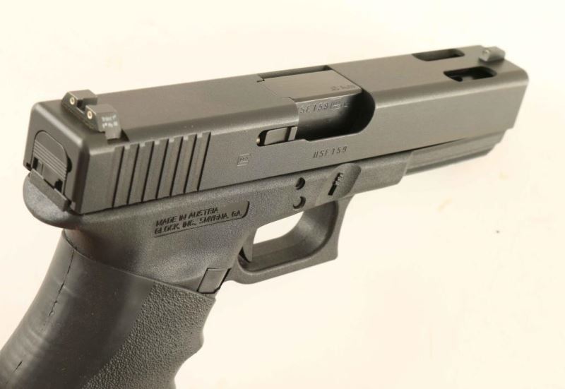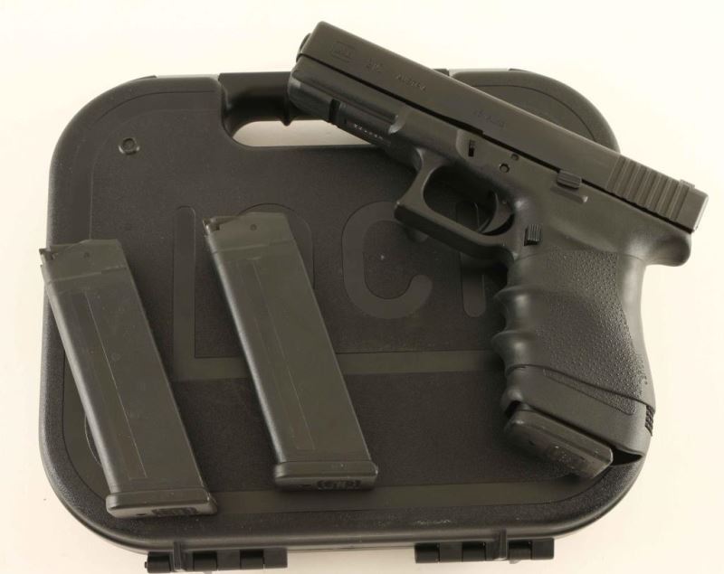 'Compensated' Austrian made full size safe-action semi-automatic pistol chambered in .45 Auto. Imported by Glock Inc. of Smyrna, G.A. with import information on the right side of the frame. Features a black coated slide, 4.6" ported barrel, Trijicon three-dot night sights, trigger safety, push button magazine release, factory 13 round magazine, and a durable black polymer frame with integral accessory rail & a Hogue HandALL slip-on black rubber grip sleeve. Includes the original factory hard case with documents, cleaning tools, and two additional magazine. Pistol exhibits little to no visible wear. Action is crisp, the polygonal bore is pristine and polymer is fine. Condition is NRA Perfect in box. ***Modern Firearm***