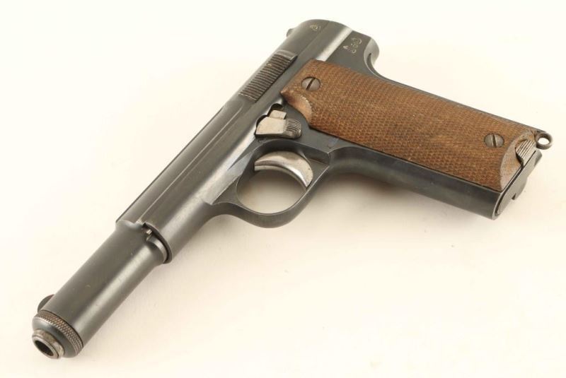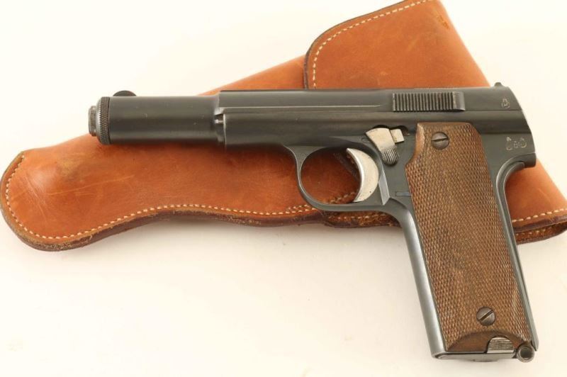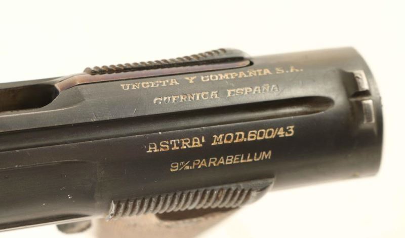 WWII era Spanish made semi-automatic pistol chambered in 9x19mm, circa 1944. This late production pistol was part of a Nazi contracted order that was never delivered and were eventually sold commercially after the war. Features a blued finish, 5.36" barrel, round blade front sight, fixed 'u' notched rear sight, smooth trigger, concealed hammer, thumb safety, grip safety, push button magazine release, factory 8 round magazine, lanyard loop, and two-piece checkered wood grips. Includes an unmarked smooth brown leather holster. No import marks. Markings: Slide - "UNCETA Y COMPANIA S.A./GUERNICA ESPANA", "'ASTRA' MOD.600/43/9M/M/ PARABELLUM", "P" inside a flaming bomb, "20037" & "37"(on the underside). Frame - knights head/"X" inside a shield, star/"O", "P" inside a flaming bomb, "20037" & "UNCETA Y COMPANIA/37" under the left grip. Barrel - "P" inside a flaming bomb & "37". Magazine - Astra logo. Pistol exhibits approximately 85% of it's original finish showing moderate holster wear and few handling marks. Action is sound, bore is excellent and the wood grips are very good as worn semi smooth. Condition is NRA Very Good. ***C&R Firearm***