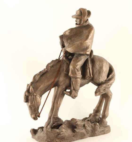 Depicting cowboy on horseback on a cold windy day. Signed on base 'Austin Prod. Inc. 1980' and measures 14"l x 18 1/4"h x 6 1/2"w.
