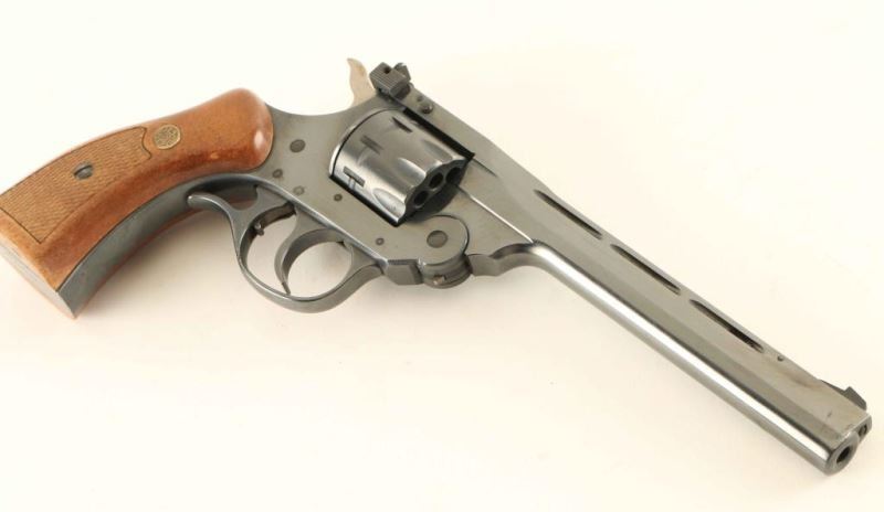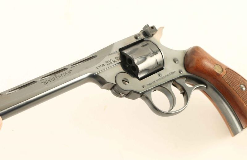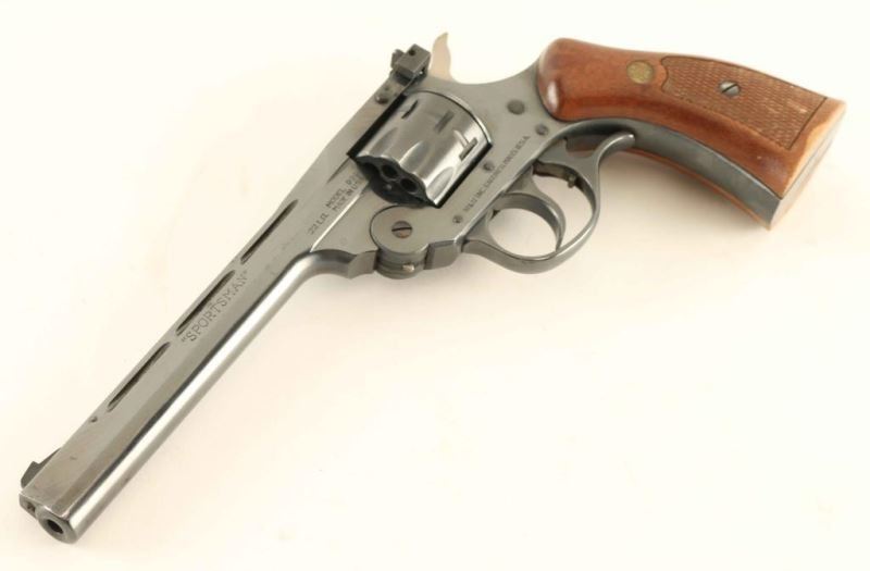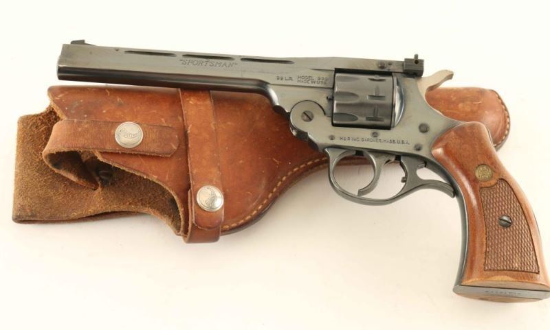 SN: BA031690 'Sportsman' Large frame double action break-top revolver chambered in .22 Long Rifle, circa 1984. Features a blued finish, ribbed 6" barrel, elevation adjustable patridge front sight, windage adjustable rear sight, fluted nine-shot 'safety rim' cylinder, finger rest trigger guard, smooth trigger with beveled edges, serrated hammer spur, and two-piece checkered walnut grips with brass H&R medallions. Includes a Hunter smooth brown belt loop holster. Revolver exhibits approximately 93% of it's original blued finish showing minor holster wear, some handling marks and scattered freckles of light surface rust, primarily on the backstrap & butt. Action is smooth with good lock-up, bore is excellent and the wood grips are very good with wear & blemishes. Condition is NRA Very Good. ***Modern Firearm***