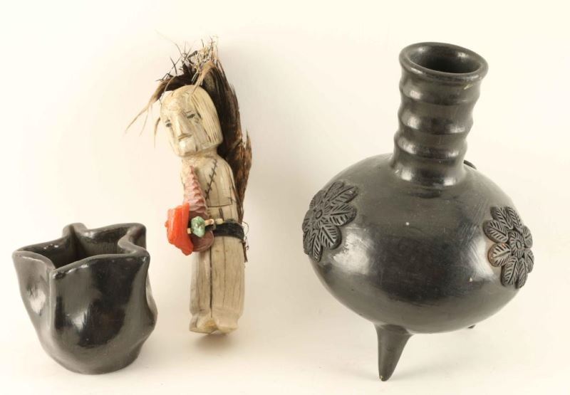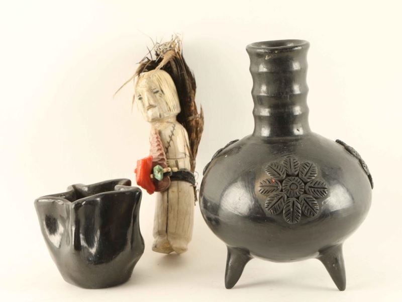 Including; Oaxacan 20th century black three footed base with flower design 6"x4", black pot with star shaped opening 2 3/8"x2 3/4", and a Navajo 20th century human fetish carved from deer horn with turquoise, coral and feathers 4 1/2"x1".