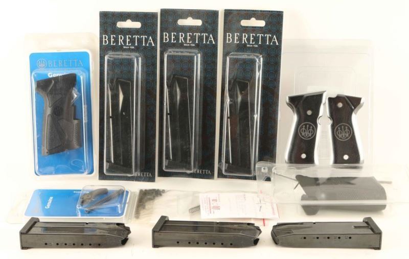 6 Beretta 92 Mags like new some in original boxes, Grips, 2 Trigger Kits, 2 92-2 Grips.