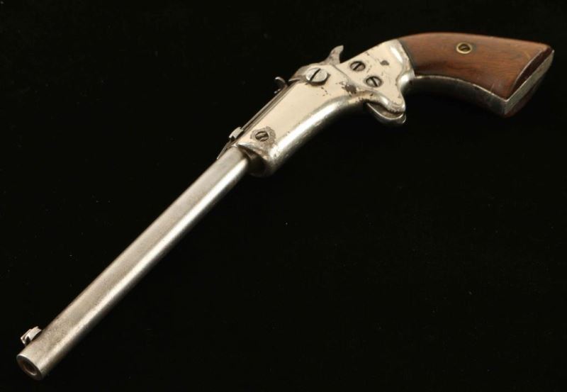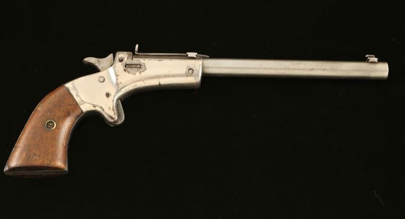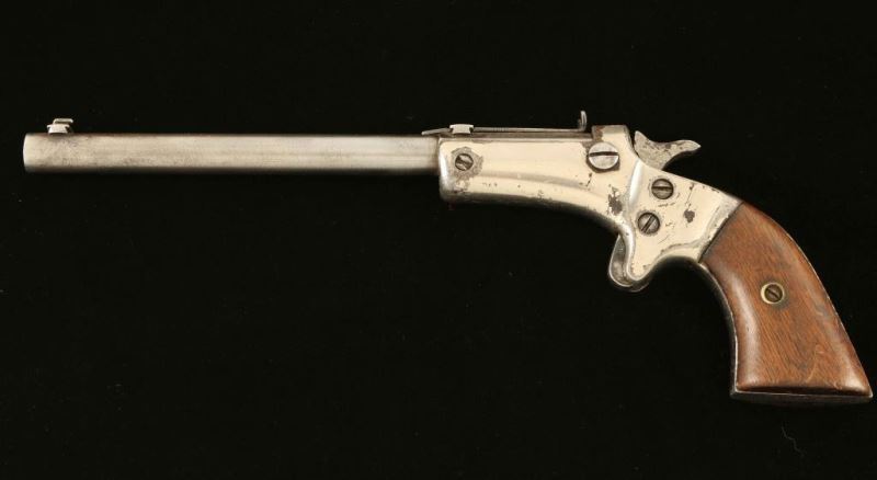 'Second Issue' Vintage tip-up single shot spur trigger pistol chambered in .22 Long Rifle, circa 1896-1916. Features a blued 6" part octagon barrel with extractor, dovetailed blade front sight with bead top, rear sporting sight(missing adjustment screw), smooth spur trigger, knurled hammer spur, nickel plated iron frame and two-piece smooth walnut grips. The barrel is primarily in-the-white showing minor traces of finish in the projected areas and has some side-to-side play around the pivot screw. The frame retains approximately 70% of it's nickel plated finish showing handling marks and scattered losses. Action performs well, bore appears smooth with scattered pitting and the wood grips are good. Condition is NRA Good. ***C&R Firearm***