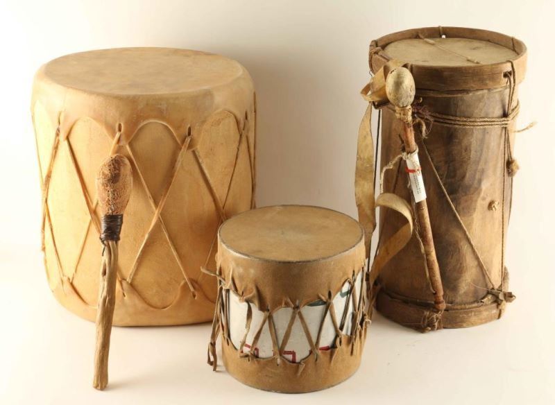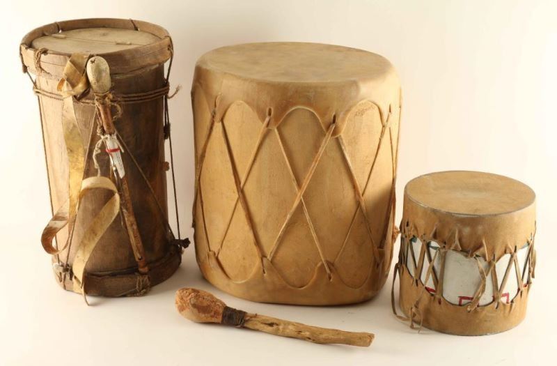 Including 20th century drum with cottonwood and rawhide construction 13"x15"x12 and drum stick made of leather and wood 13"x2 1/4", homemade drum with metal and leather construction measures 8"x8", and a 20th century drum made of wood and rawhide rope that is attached with a rawhide strap 17"x9" with drumstick.