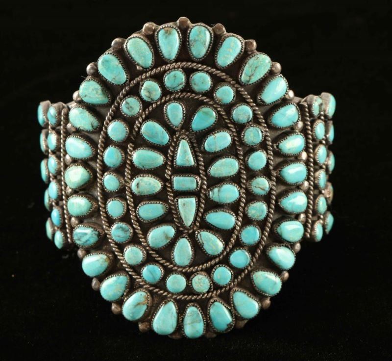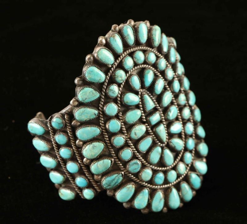 Large 3" cluster of turquoise in sterling silver. Marked 'M. Begay'. Inside of bracelet measures 2 3/8".