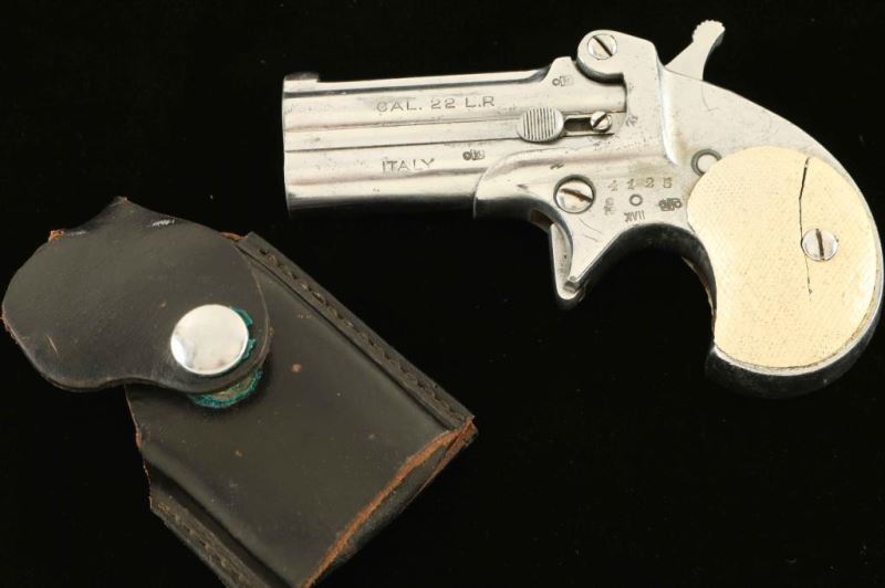 Vintage Italian made over/under double barrel derringer chambered in .22 Long Rifle, circa 1961. Features a nickel plated finish, 2 7/8" barrels, manual extractor, fixed sights, auto-rotating barrel selector on the hammer, smooth spur trigger and two-piece checkered faux ivory grips. Includes a smooth black leather belt loop holster dated 1963. The derringer retains the majority of it's nickel finish exhibiting some finish loss around the muzzle and heavy handling marks throughout. Action performs well, bores are very good and the plastic grips are fair with worn points & a large crack in the left panel. Condition is near NRA Good. ***C&R Firearm***