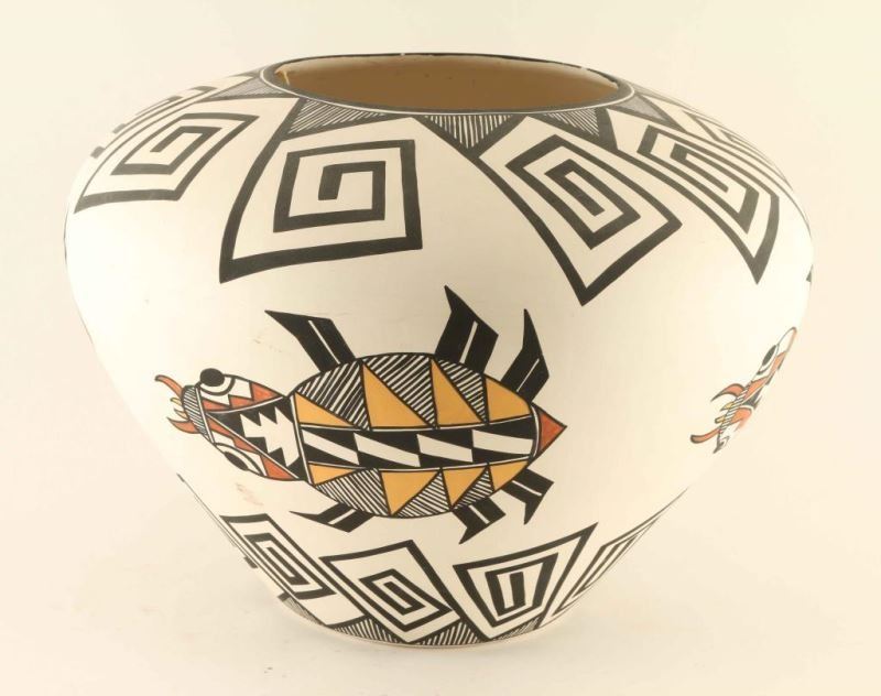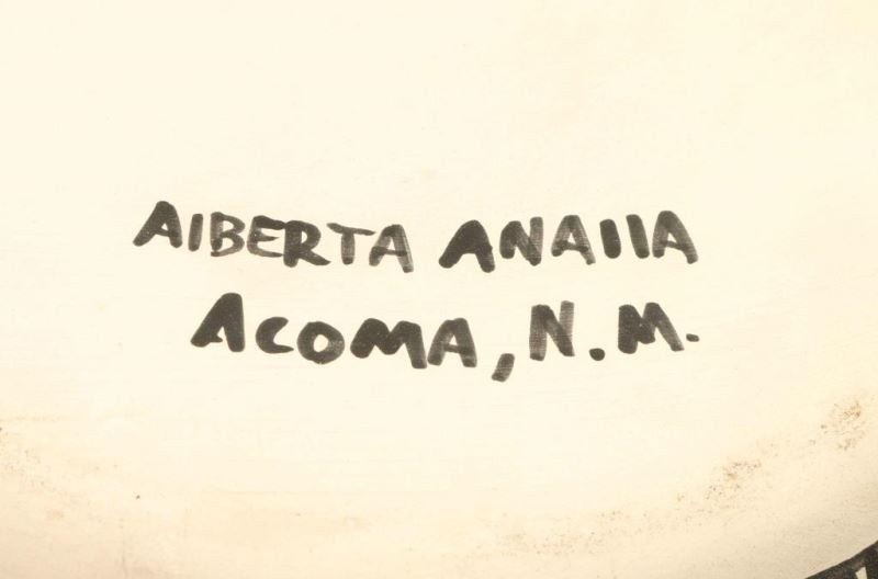 Signed 'Aiderta Anaiia' measures 12"x16". Minor chip to lip of pot.