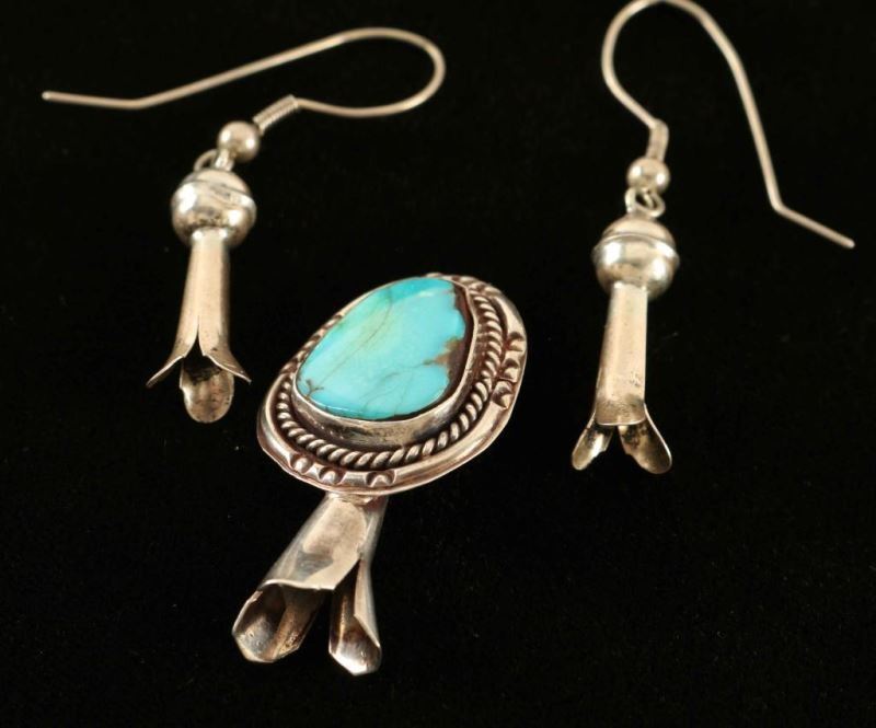 Pendant with triangular turquoise stone set in a rope design of sterling with a squash blossom below it and two squash blossom earrings dangling from french hooks.