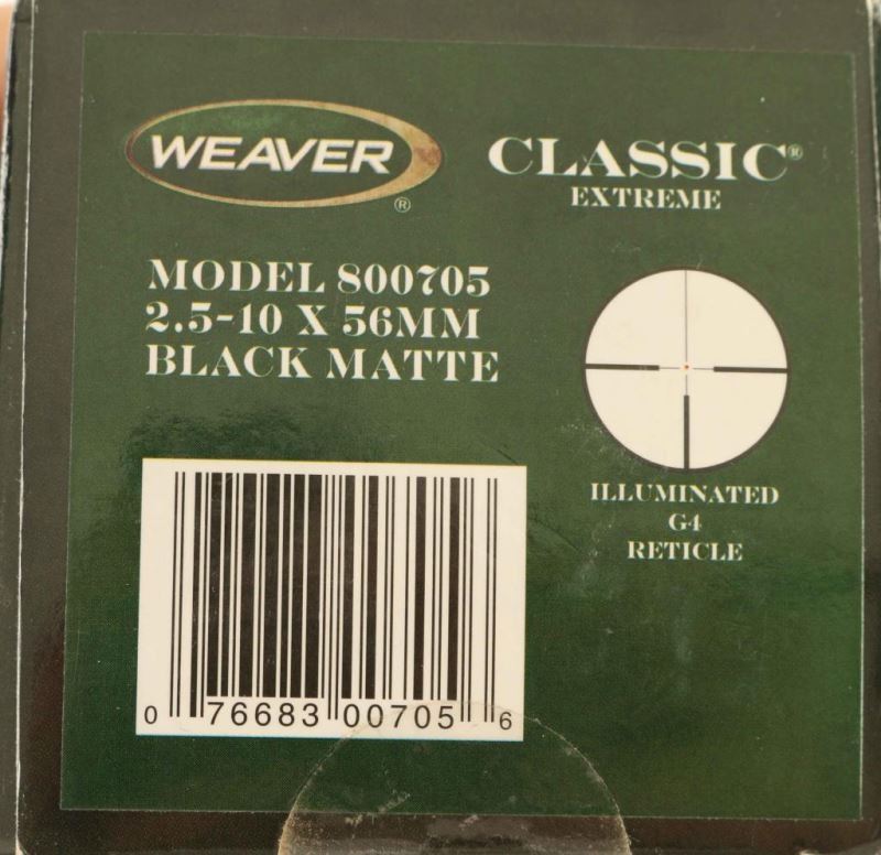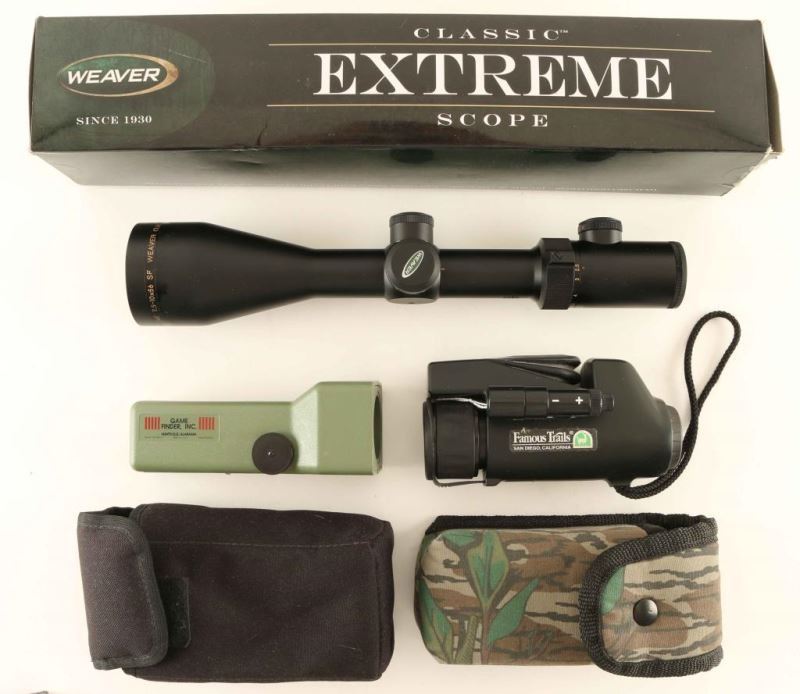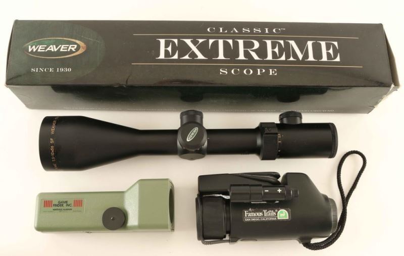 Famous Trails Night Vision scope in case, Weaver Extreme Classic scope 2.5-10x56mm with illuminated G4 reticle new in box with papers, and a Game Finder Inc. infrared game detector with case.