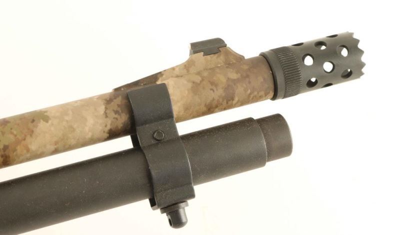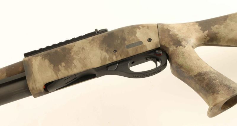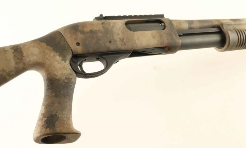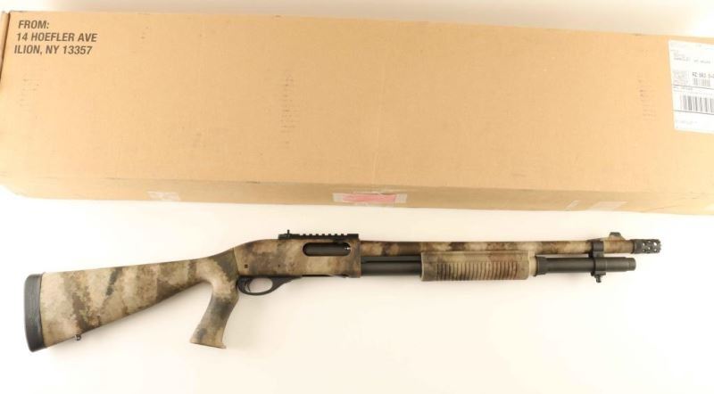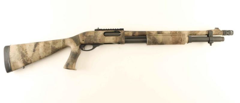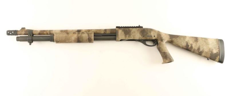 'A-Tacs Camo' American made slide action tactical shotgun chambered for 2 3/4" or 3" 12 gauge shells. Features a digital urban camouflage finish, 18.5" barrel, extended cylinder choke with ports & ridged teeth, XS dovetailed blade front sight with white dot, XS scope rail with an adjustable ghost ring rear sight, extended magazine tube, cross bolt safety, smooth trigger with beveled edges, polymer triggerguard, grooved synthetic slide handle, and pistol grip stock with factory SuperCell recoil pad. Factory stock dimensions: Drop at comb: 1 1/2", Drop at heel: 2" and Length of pull 13.75". Includes the original factory cardboard box. Shotgun exhibits nearly all of it's light absorbing finish showing very little wear. Action is very smooth, bore appears excellent but dirty and the synthetic stocks are fine. Condition is NRA Excellent. ***Modern Firearm***