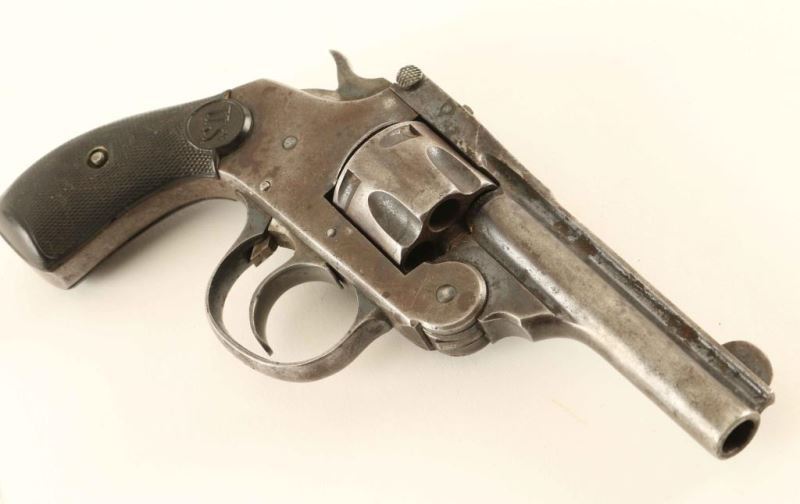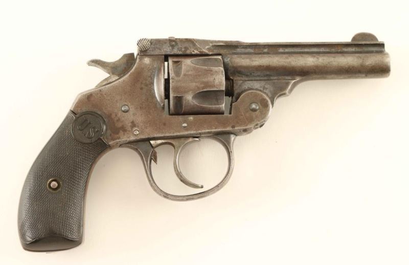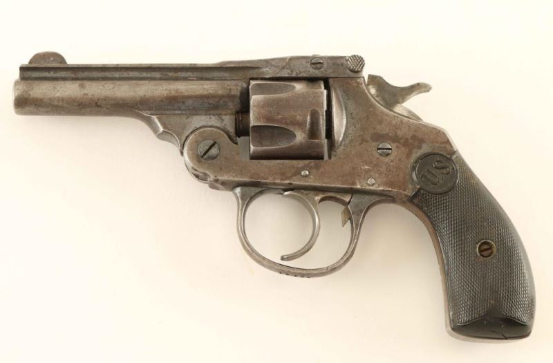 SN: 13128 Trade name medium frame double action top-break revolver chambered for .32 Centerfire, manufactured by Iver Johnson circa 1911-1935. Features steel construction, a blued finish, ribbed 3" barrel, round blade front sight, 'u' notched rear sight, fluted five shot cylinder with star extractor, smooth trigger, knurled hammer spur, and two-piece checkered black hard rubber grips with "U.S." molded into the top. Revolver exhibits approximately 15% of it's original finish with the balance of the metal surfaces turned to brown patina. Action is smooth with some play in the lock-up, the bore is bright with scattered pitting and the hard rubber grips are good with worn points & a crack in the butt of the left panel. Condition is NRA Fair to Good. ***C&R Firearm***