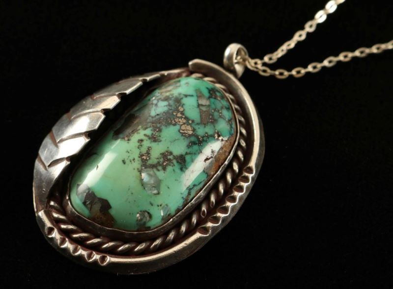 Large 1 1/4" blue green turquoise stone set in a sterling silver rope and feather design with silver chain.