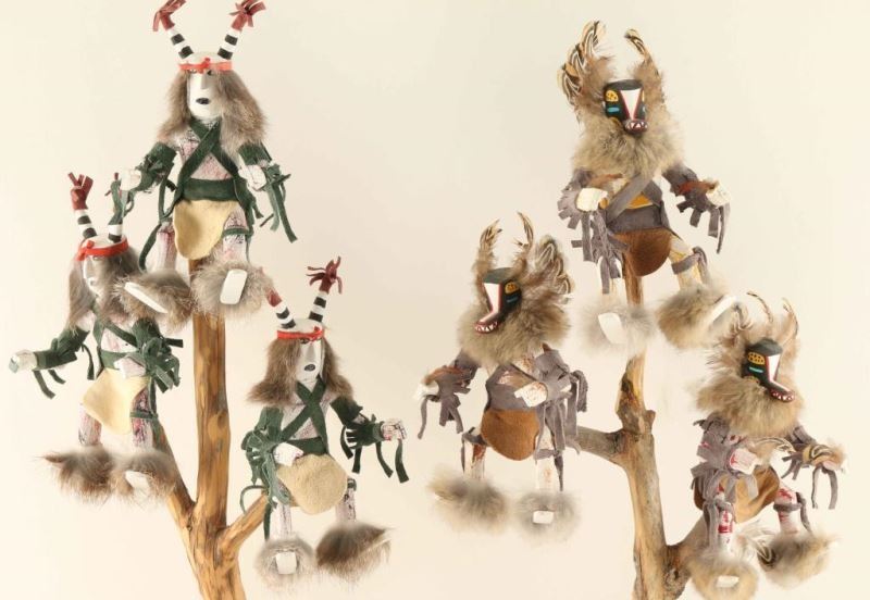 (1) Badger Family Tree all wood construction hand painted with feather, fur and leather accents. Measures 17 1/2"h x 10 1/2"w x 3 3/4"d on slab base. Signed 'L. Joe'. (1) Clown Kachina Tree all wood with hand painting with leather and fur accents on slab base. Measures 18 1/2"h x 10"w x 4 1/4"d. signed 'L Joe'.
