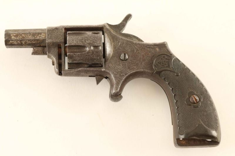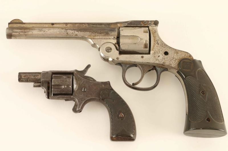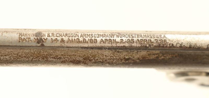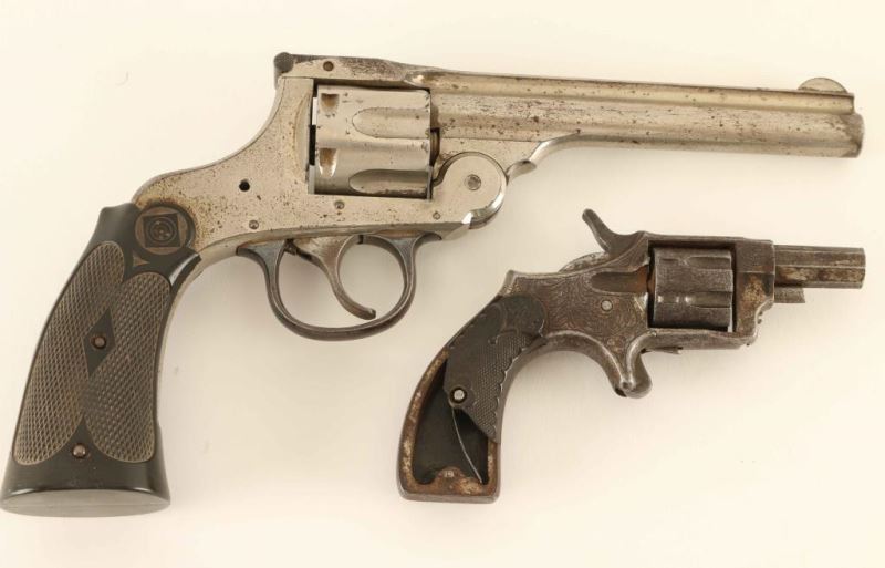 (#1) Harrington & Richardson Automatic Ejecting Third Model, First Variation .32 Smith & Wesson Long SN: 144716 - Vintage double action revolver manufactured circa 1905-1908. Features a nickel plated finish, ribbed 5" barrel, round blade front sight, 'v' notched rear sight, fluted six-shot cylinder with star ejector, smooth trigger, blued trigger guard, and two-piece diamond checkered black hard rubber grips with target insignias. Serial numbers match on the barrel, cylinder and frame. Approximately 70% finish intact overall. Missing the hammer, hammer screw and possibly more. Bore is fair and the hard rubber grips are very good. *C&R Firearm* (#2) T&J Model Czar .22 Short SN: 2074 - Engraved antique small frame single action spur trigger revolver. Features a nickel plated finish, cut down 1 1/2" octagonal barrel, fluted seven-shot cylinder, knurled spur trigger, knurled hammer spur, scroll engraving, and two-piece checkered brown hard rubber grips with T&R decor. Revolver bears an aged dark brown patina with small amounts of it's nickel plated finish preserved in protected areas. This action is non-working & may need additional parts, the bore is evenly rusted and the grips are poor with losses in both panels. *Antique Firearm*