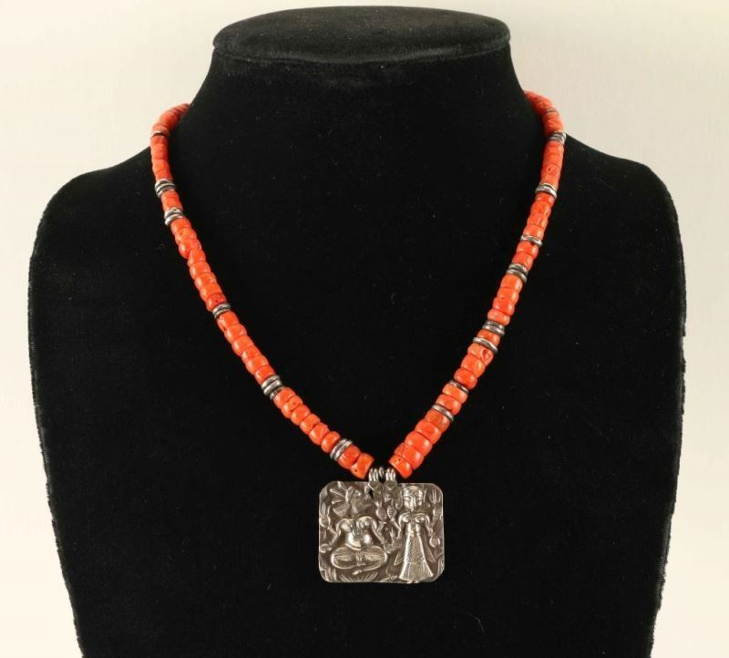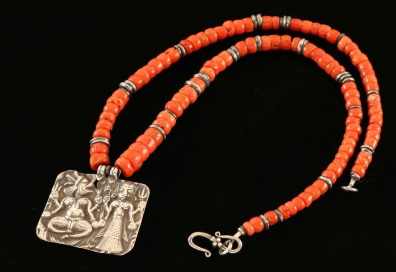 Beaded coral necklace with repousse of God and Goddess from India by Nadine Leo. Pendant measures 1 3/8"x1 1/8". Necklace 17" long.