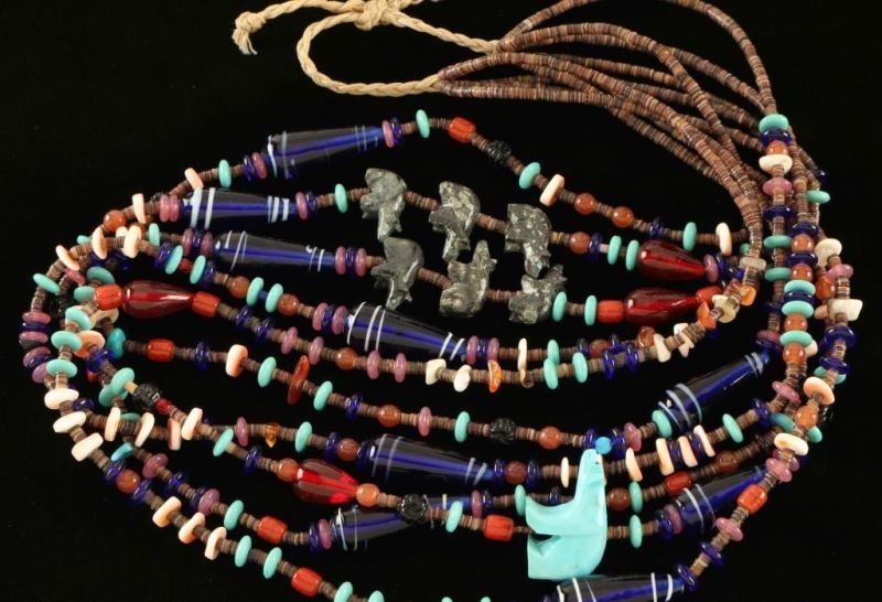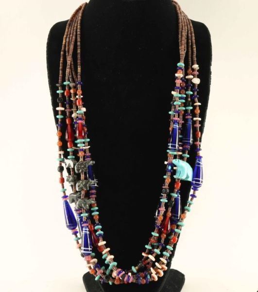 Large turquoise bear and six small stone bears in a beautiful necklace with heishi, turquoise, spiny oyster and others with striking dark blue and burnt orange glass beads. Very nice ensemble.