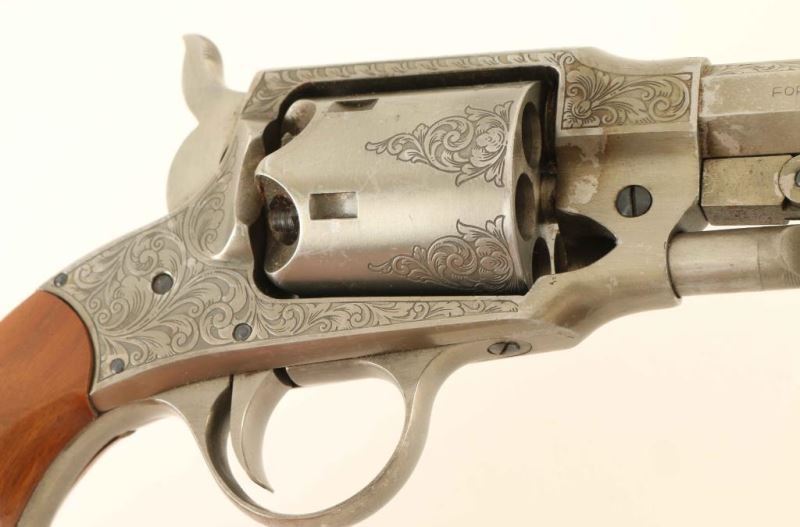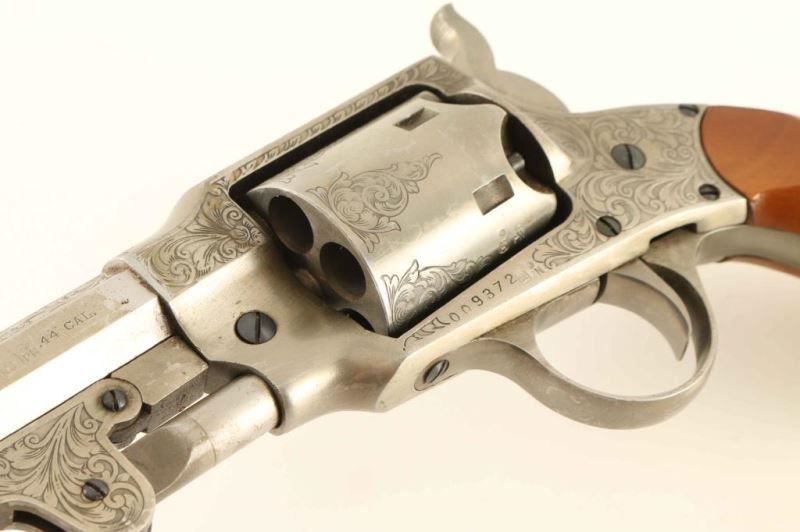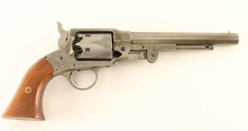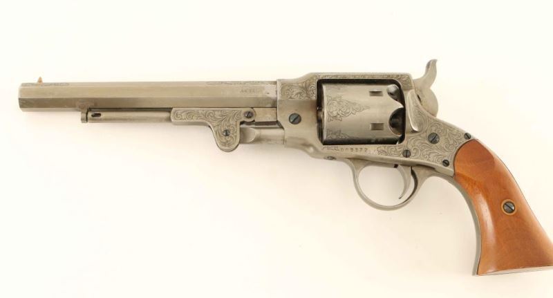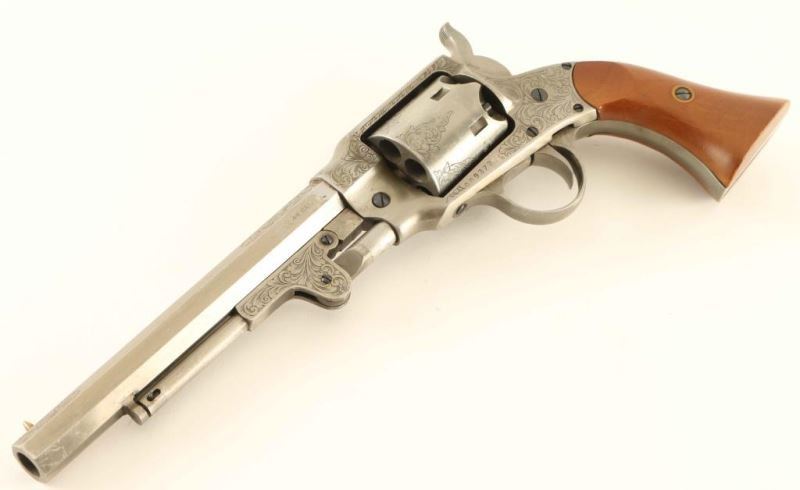 SN: 009372 Engraved Italian made reproduction of the Civil War era single action percussion revolver chambered for .44 caliber ammunition, circa 1980. In 1865 the Roger & Spencer revolver was awarded a contract for 5,000 units by the United States government but the delivery of the firearms was made too late for service and where eventually sold off in 1901. Features an antique finish, 7.5" octagon barrel, brass cone front sight, 'v' notched rear sight, loading lever, non-fluted six shot cylinder, smooth trigger, serrated hammer spur, scroll style engraving and two-piece smooth wood grips. Revolver exhibits approximately 90% of it's original finish showing scattered scratches & losses. Action is strong, bore is excellent and the wood grips are very good with blemishes. Condition is NRA Very Good.