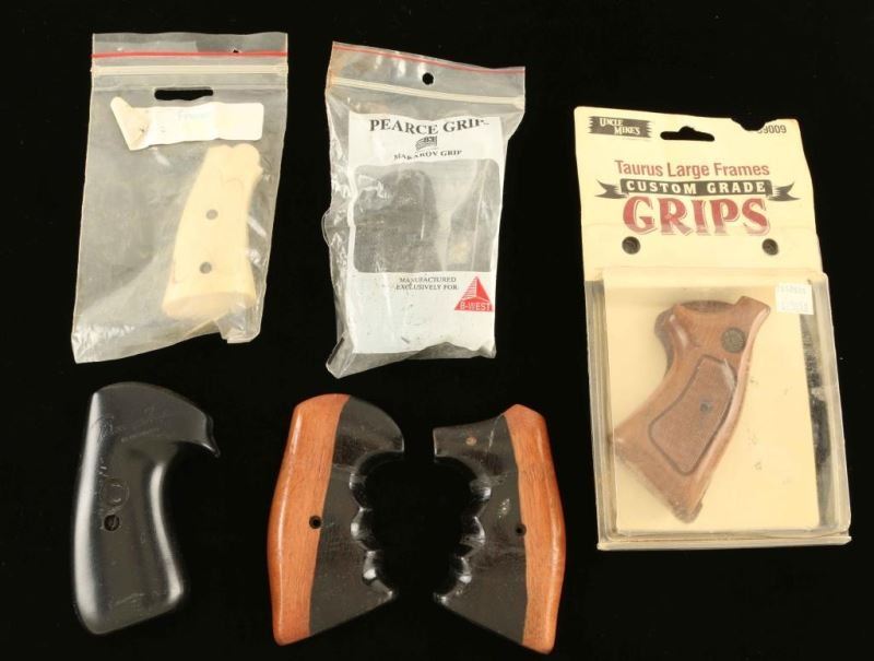 Including; Uncle Mike's wood grip for large frame Taurus, Makarov Pearce composite grip, J frame faux ivory grip, and two other large frame revolvers-one wood and one plastic.