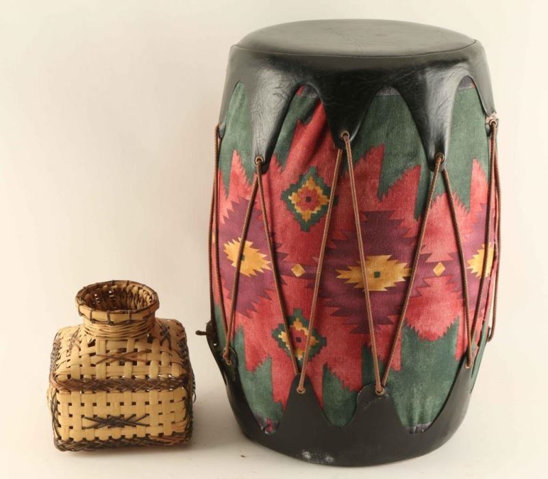 Drum stool-base covered with fabric in a Native print in burgundy, gold, and green topped with black vinyl and rope run through grommets on the sides to represent drum appearance. Measures 18"h x 10"dia. Also includes small basketry animal trap.