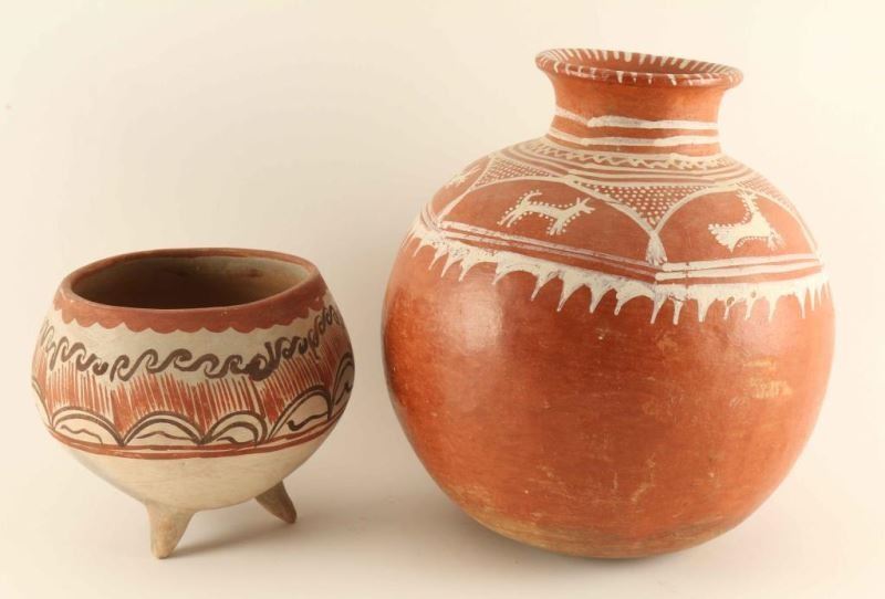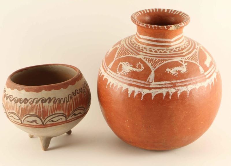 Round brown clay pot with three legs and hand painted swirl designs measures 8"x6 /12", round red clay pot with animal and geometric design painted in white measures 10 1/2"x11 1/4"-chip in rim.