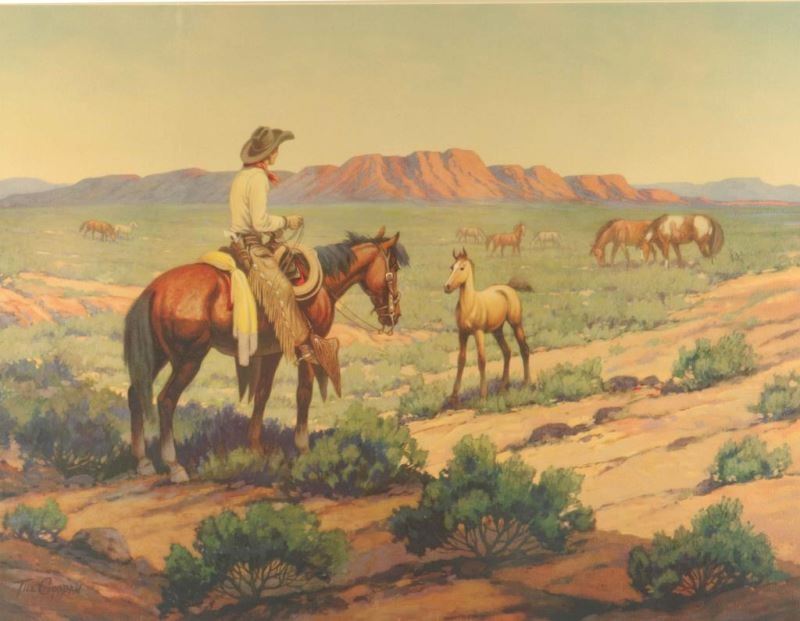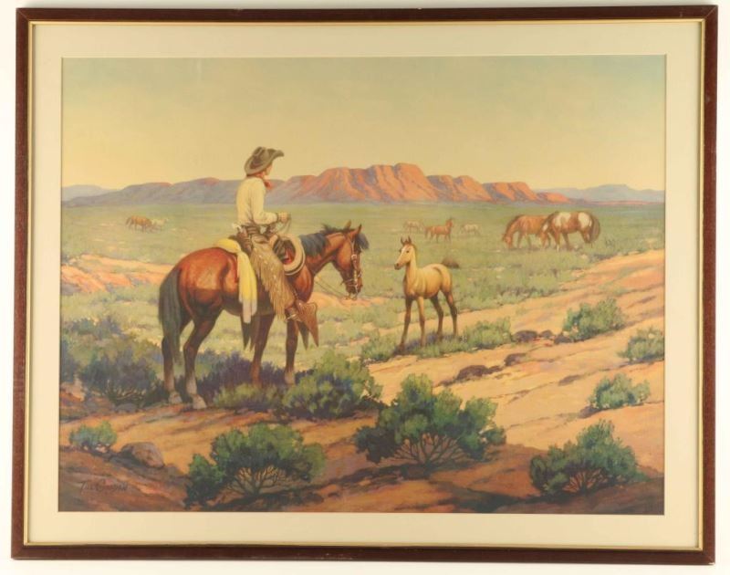 by noted western artist Til Goodan depicts a western scene in wood frame image size is 28 1/2"X23"