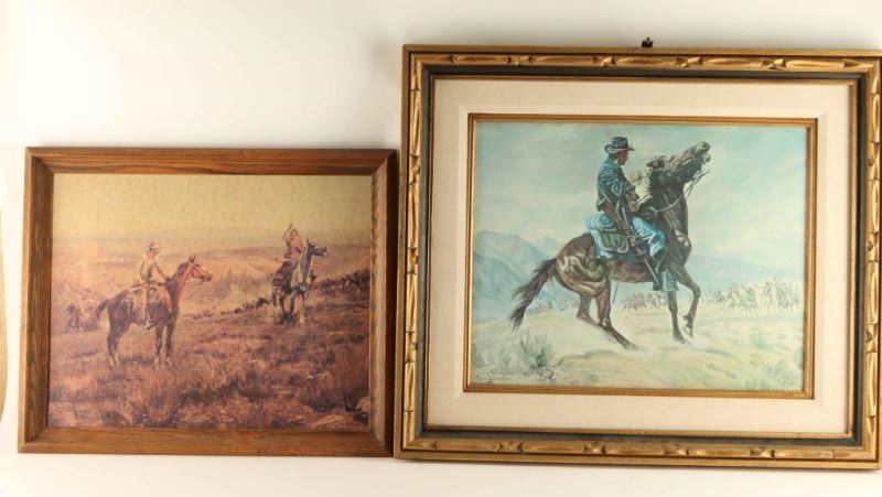 (1) CM Russell print of cowboys and indian image size is 19"x16" (1) Joe Grandee print of soldier on horse back image size is 20"X16" in wood frames.